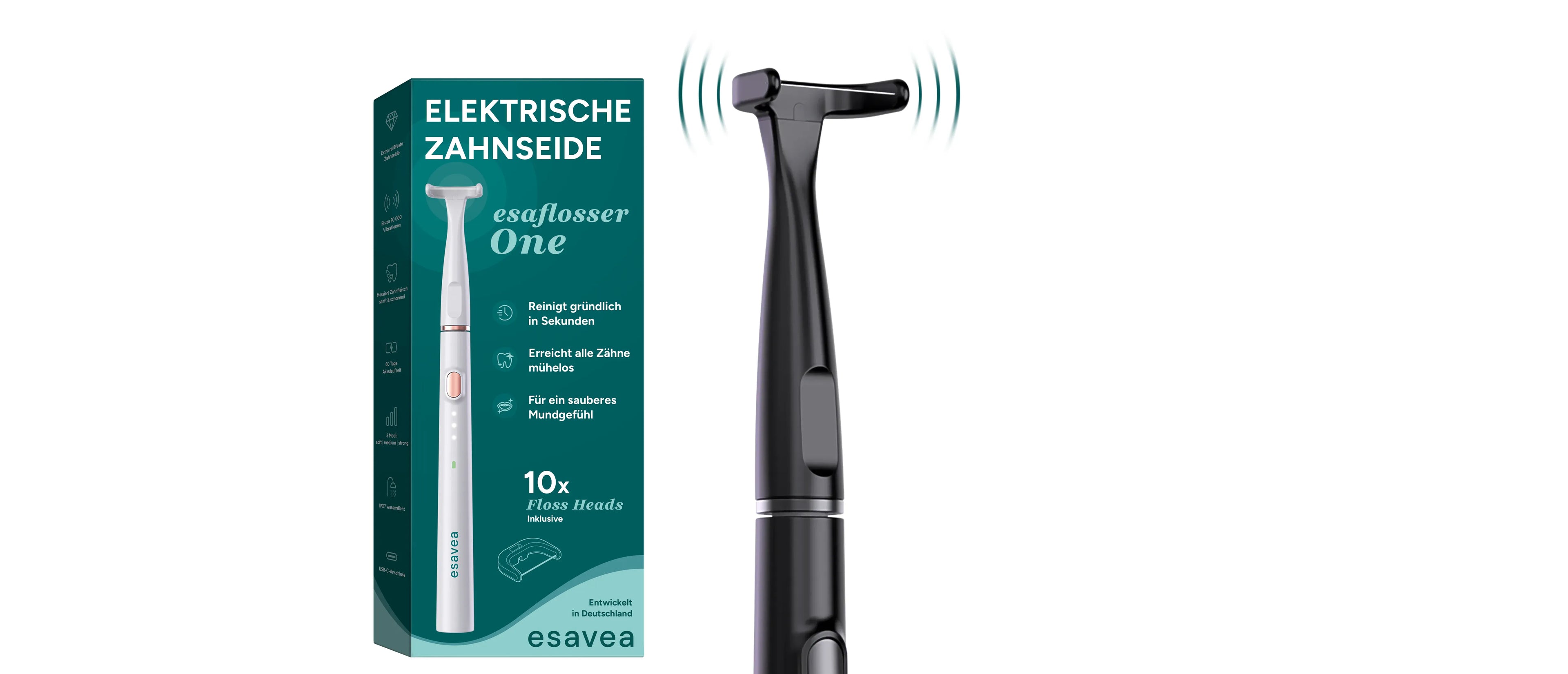 Erlebe täglich das Gefühl einer professionellen Zahnreinigung – mit dem esaflosser One, dem innovativen Zahnseidegerät (elektrische Zahnseide) von esavea. Dank moderner Schalltechnologie entfernt er zuverlässig Plaque (Zahnbelag) und Speisereste aus den Zahnzwischenräumen – sanft zum Zahnfleisch und in nur 90 Sekunden.