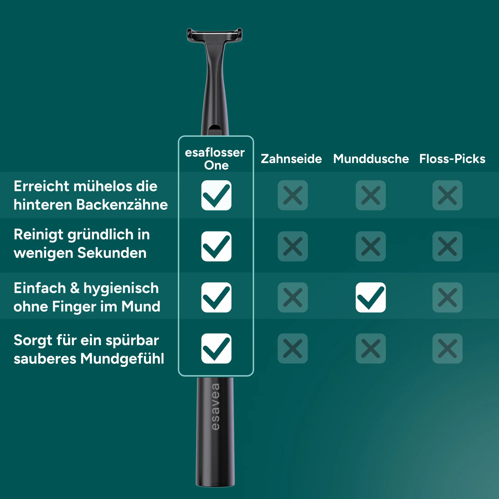 - Einfacher als klassische Zahnseide, Sticks oder Mundduschen